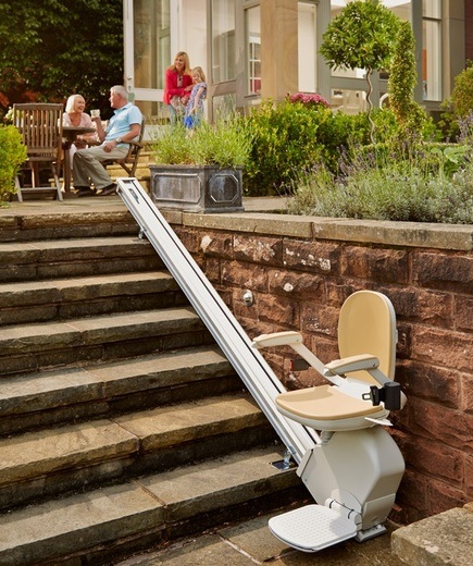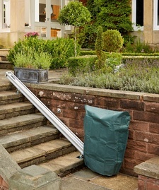 Alle Metallteile des Treppenlifts sind entweder aus Aluminium gefertigt oder in Öl gehärtet, verzinkt und mit Pulver beschichtet. Die Plastikbauteile sind hitze- und UV-beständig, so dass der Treppenlift vor Farbverblassung und Hitzeschäden geschützt ist. Der Saniplus Treppenlift für den Außenbereich ist die ideale Lösung für alle Außentreppen, die Witterungseinflüssen ausgesetzt sind, wie z.B. Gartentreppen, Sonnenterrassen, Eingangsterrassen, Veranden sowie Garagen- und Kellertreppen. Auch die für den Außenbereich konzipierte Ausführung des Saniplus Treppenliftes bietet die bewährte Fahrqualität und Leistungsfähigkeit, durch die sich unsere Treppenlifte weltweit einen Namen gemacht haben. Zu diesem Treppenlift gehört auch eine robuste Abdeckhaube damit der Lift vor Laub und Schnee geschützt ist.